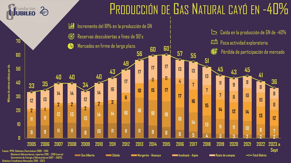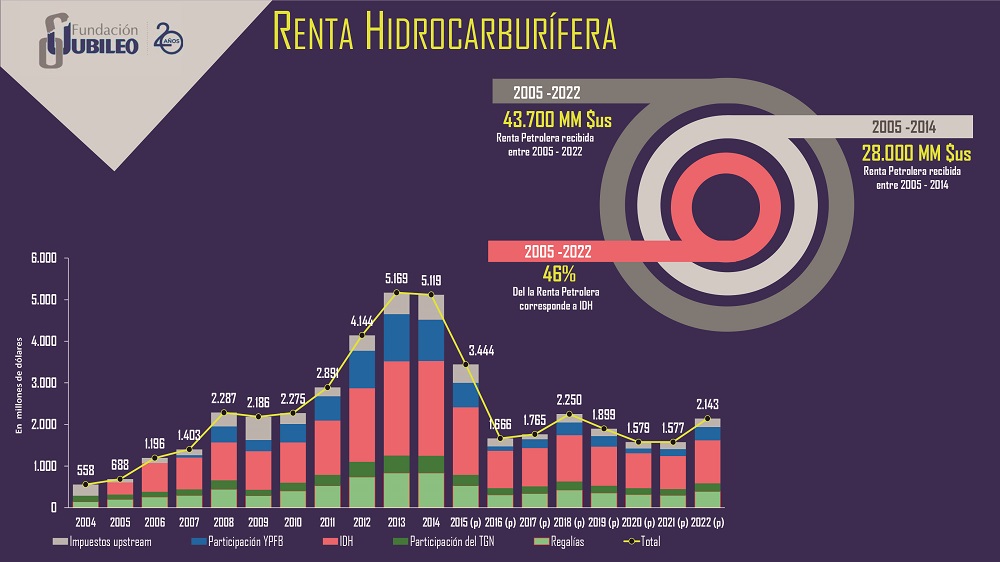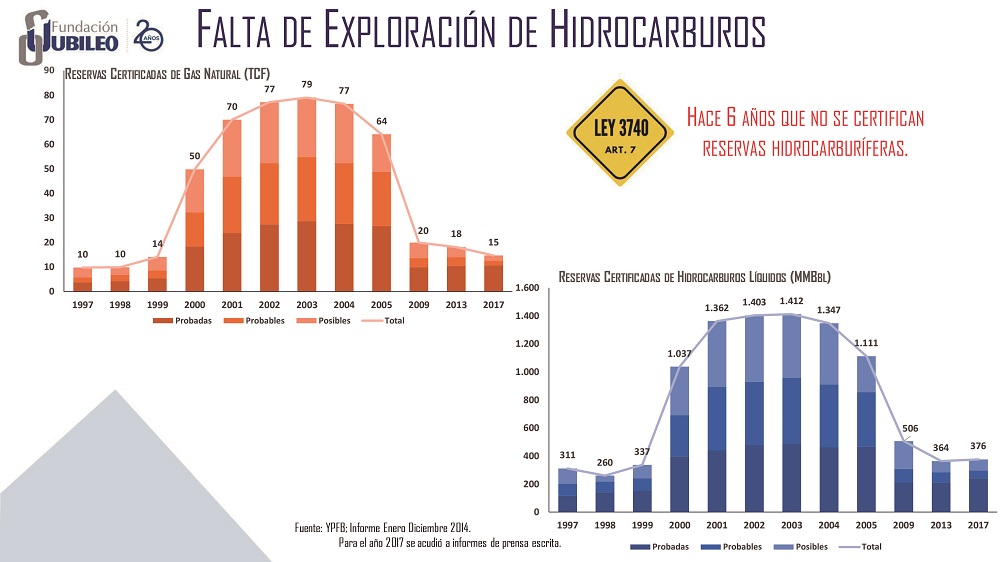 La Fundación Jubileo presentó una propuesta para la elaboración de una nueva ley de hidrocarburos en Bolivia con ocho ejes, con la cual esperan revertir la crisis generada por la administración estatal de los últimos 20 años. Entre las principales reformas que se promueve, además de reformular la política de subvención al combustible en el país, está la seguridad jurídica, transparencia para la firma de contratos y modificar el tipo de uso que los gobiernos departamentales y municipales del dan a las regalías.