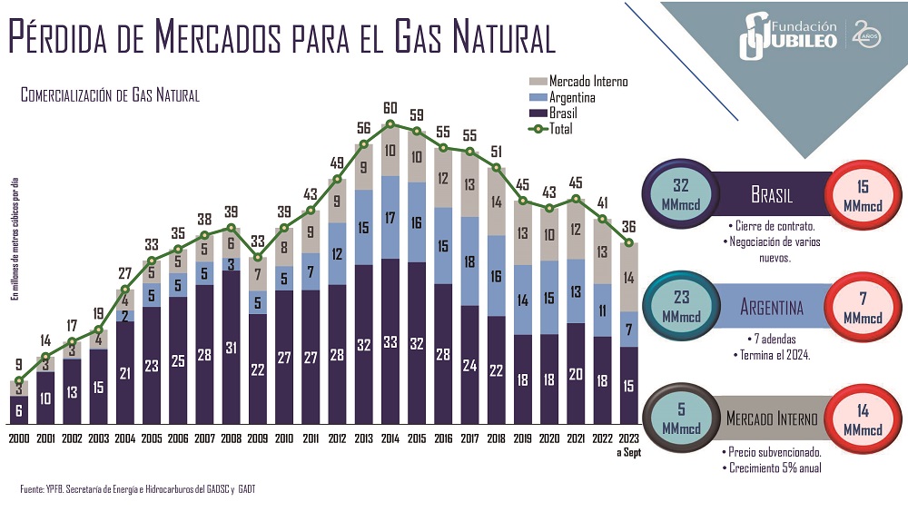 La producción de gas natural cayó en -40% respecto a 2015, año de mayor producción, lo que ha obligado a renegociar los contratos de exportación por menores volúmenes llevando al país a perder el mercado argentino, lo que se concretará a partir de mediados de 2024, además de disminuir significativamente su participación en las ventas al mercado de gas brasilero.