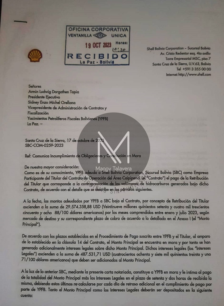 El 17 de octubre, la representante de Shell Bolivia Corporation (SBC), Sucursal Bolivia, Cristina Núñez, remitió una carta notariada al presidente de Yacimientos Petrolíferos Fiscales (YPFB), Armin Dorgathen, para recordarle que está en mora el pago por el contrato de hidrocarburos suministrados desde enero hasta julio de este año, monto que suma más de 30 millones de dólares. Además, le recuerda que el pago debe ser hecho en moneda norteamericana y no así en bolivianos.