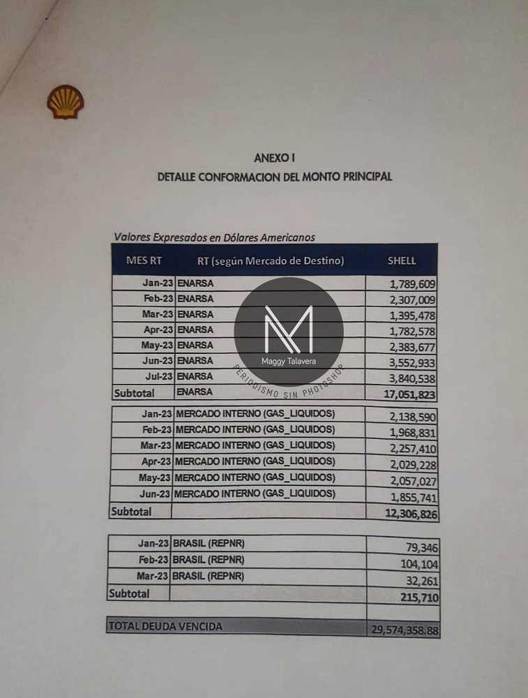En otra parte del texto, la representante de Shell también señala que, de acuerdo con la cláusula 14 del contrato, se establece que además del monto adeudado, se debe cancelar una multa o “interés”, el cual, en esa fecha ya era de 487.531 dólares, lo que hacía un total de 30.052.890,59 de deuda.