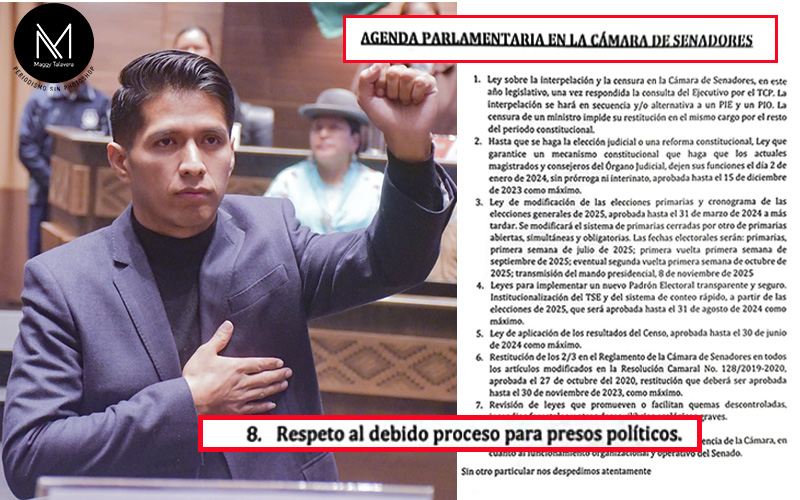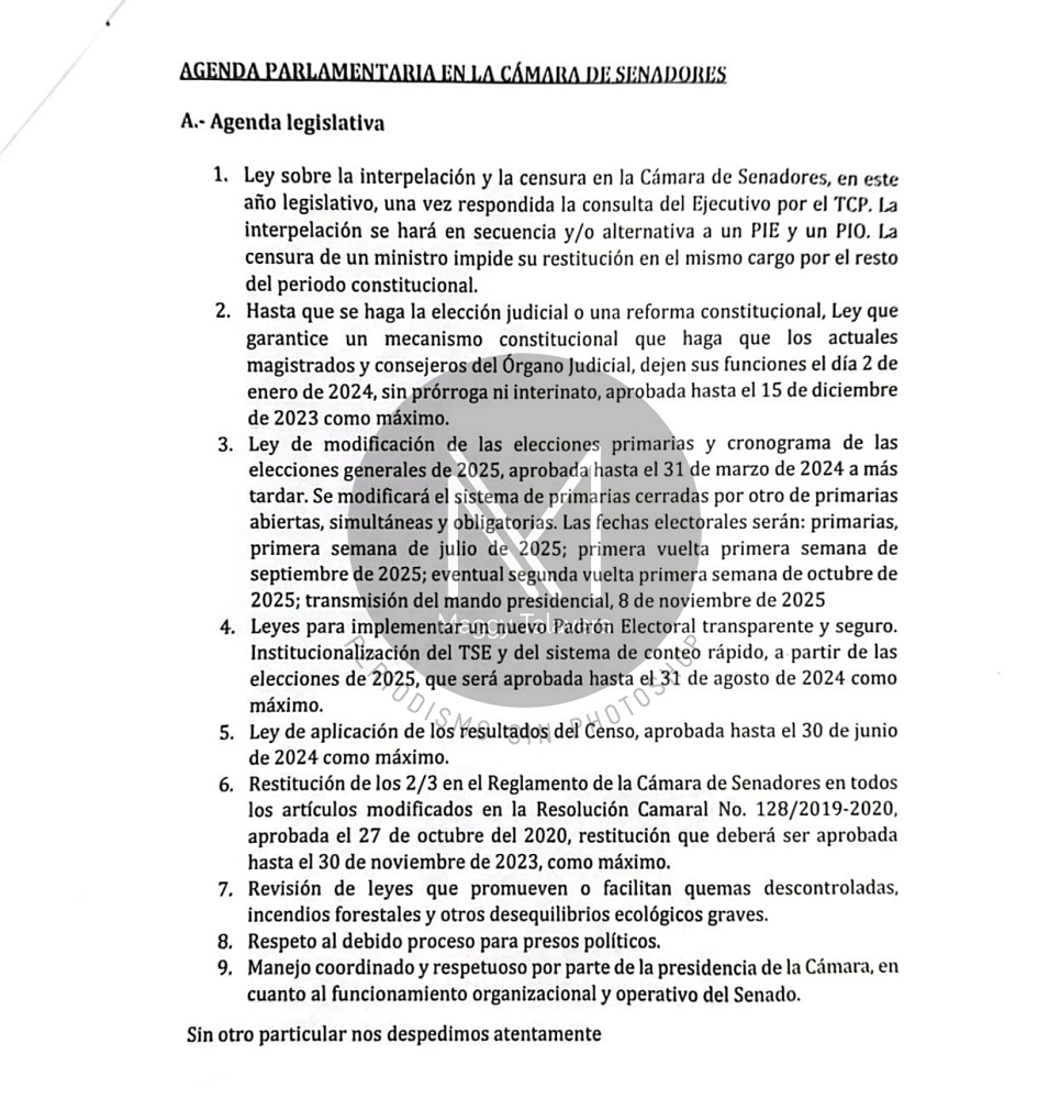 Los senadores que apoyan al cocalero Evo Morales se comprometieron a aprobar leyes para que los actuales magistrados dejen su cargo el 2 de enero, destitución de ministros, un nuevo padrón electoral, reposición de los 2/3 y aplicación de los resultados del censo en 2024.