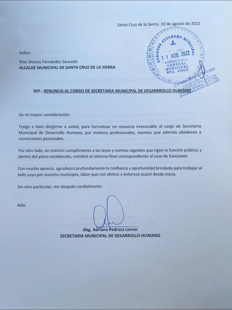 Renuncia la secretaria municipal de Desarrollo Humano de la Alcaldía de Santa Cruz de la Sierra, abogada Adriana Pedraza Lerner, “por motivos profesionales, mismos que además obedecen a convicciones personales”.