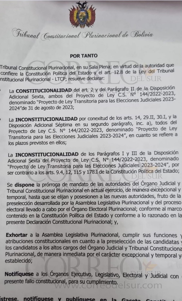 Los magistrados del Tribunal Constitucional Plurinacional (TCP) emitieron una resolución, a través de la cual se autoprorrogaron en el cargo, por tiempo indefinido, al igual que las máximas autoridades del Órgano Judicial. Dicha ampliación de mandato se dará hasta que se posesionen a las nuevas autoridades que resulten ganadoras en las judiciales, cuya fecha de realización es incierta, debido a que la Asamblea Legislativa Plurinacional (ALP) no ha elaborado la ley para la preselección de candidatos y el proceso electoral.