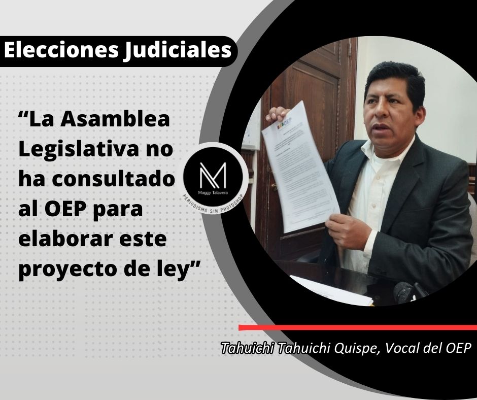 De la misma forma, Tahuchi criticó que el proyecto de “Ley transitoria para las elecciones judiciales 2023-2024”, aprobado en la Cámara de Senadores la pasada semana, no fue consensuado con el OEP. “No nos han invitado, no nos consultaron para ese proyecto de ley, sobre el tiempo que se requiere” para organizar las elecciones judiciales, afirmó el vocal.