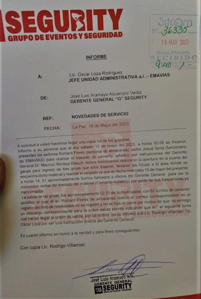 “Informo que el día 13 de mayo de 2023, a horas 00:06 se hicieron presentes Richard Flores (personal de almacenes), Josué Soria (funcionario de Emavías) para realizar el traslado de cemento asfáltico, por instrucciones del gerente general, Mauricio Berdeja Blacutt, dichos funcionarios abrieron la puerta del garaje para el ingreso de tres grúas que ellos trajeron”, señala parte del informe emitido por “G” Segurity.