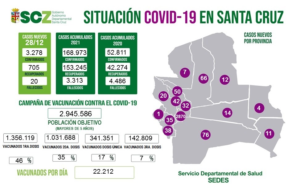 Santa Cruz, 28 de diciembre de 2021.- Carlos Hurtado, gerente de Epidemiología del Sedes, informó que 41 son los municipios que registraron nuevos casos positivos del virus, haciendo una suma de 3278 en la jornada, los casos están distribuidos en los municipios de San Rafael, Saipina, Quirusillas, Moro Moro y Cuatro Cañadas (1), San Pedro (2), Puerto Quijarro, Postrer Valle, Okinawa (3), San Matías, San Juan, San José, Pailón (4), Fernández Alonso, Roboré, San Julián (6), Gutiérrez, Ascención (7), Puerto Suarez (8), Lagunillas (10), San Ignacio, Boyuibe (12), Concepción (13), San Javier, Mairana (14), Portachuelo, Buena Vista (16), Cotoca (18), Samaipata (20), Cabezas (21), Colpa Bélgica, Camiri (26), Warnes (29), Vallegrande (31), San Ramón, El Torno (32), Porongo (34), Montero (42), La Guardia (77) y Santa Cruz de la Sierra con 2709 casos, teniendo un índice de positividad del 42% .