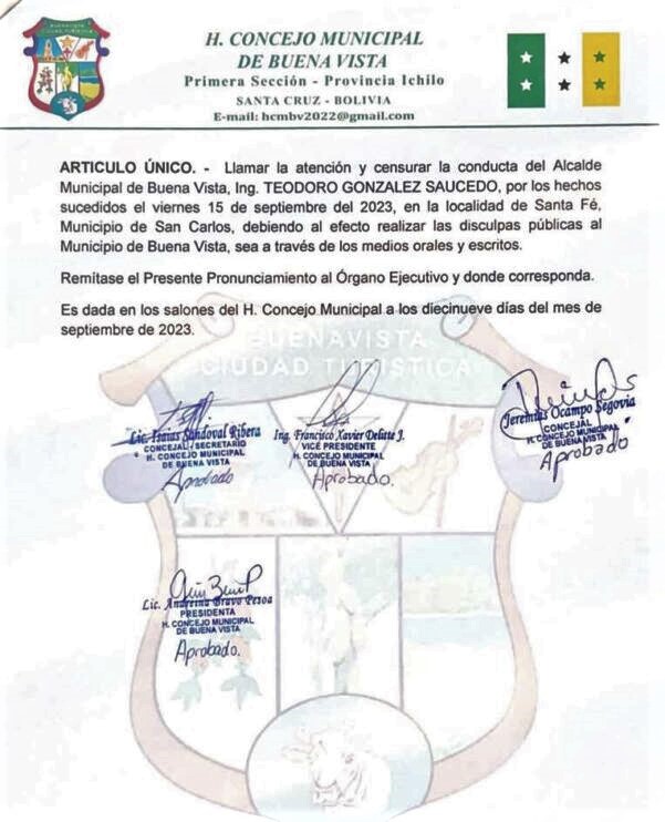 “Llamar la atención y censurar la conducta del alcalde municipal de Buena Vista, Teodoro Gonzales Saucedo, por los hechos sucedidos el viernes 15 de septiembre del 2023, en la localidad de Santa Fe, municipio de San Carlos, debiendo al efecto realizar las disculpas públicas al Municipio de Buena Vista, sea a través de los medios orales y escritos”, señala el artículo único del pronunciamiento emitido por el Concejo Municipal el 19 de septiembre.