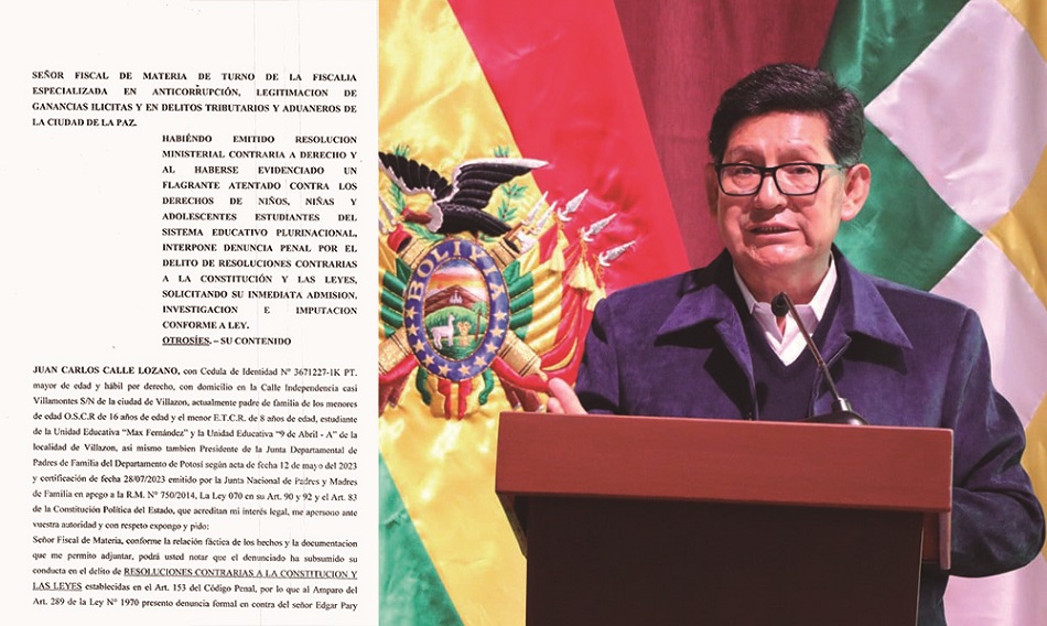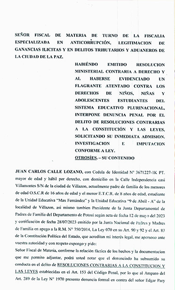 El presidente de la Junta de Padres de Familia de Potosí, Juan Carlos Calle, presentó la denuncia contra Edgar Pary ante la Fiscalía de La Paz, por abrogar una norma que suspendía a maestros, imputados por violaciones, estupro o acoso sexual, lo que a su vez permitió que estos postulen en el proceso de institucionalización.