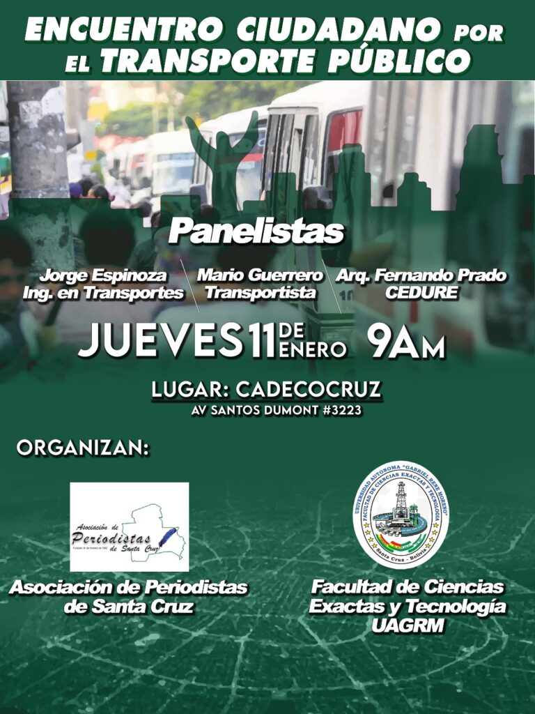 Conscientes de esa dificultad y decididos a contribuir con un nuevo y efectivo esfuerzo que permita reponer el tema en la agenda pública, acompañado de propuestas viables para resolver el problema, es que la Facultad de Ciencias Exactas y Tecnología de la Universidad Autónoma Gabriel René Moreno (Uagrm) y la Asociación de Periodistas de Santa Cruz (APSC) convocan al Encuentro Ciudadano por Transporte, a realizarse este jueves 11 de enero en instalaciones de la Cámara Departamental de la Construcción de Santa Cruz (Cadecocruz), a partir de las 9:00.