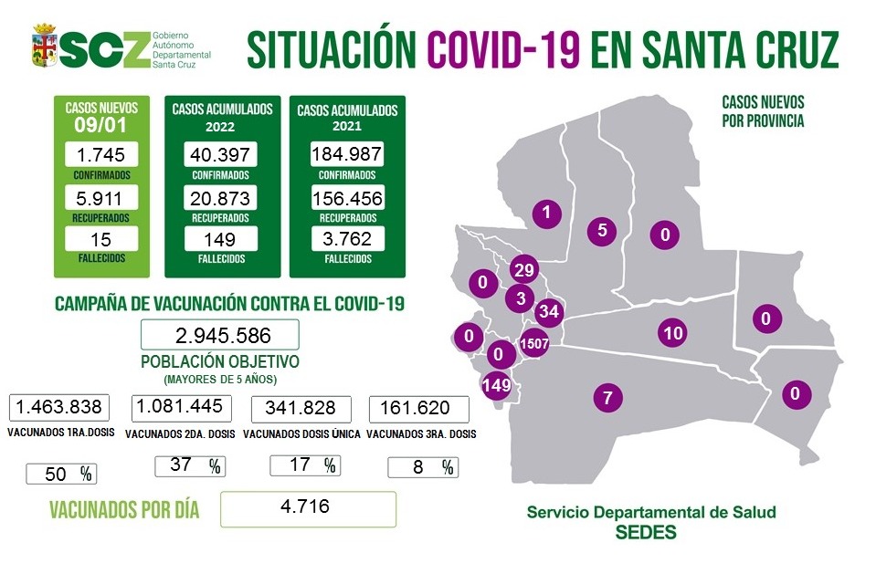 Santa Cruz, 9 de enero de 2021.- Este domingo 9 de enero, el reporte diario emitido por el Sedes de la Gobernación reporta 1.745 casos positivos de covid-19, distribuidos en 20 municipios cruceños, cantidad que representa el 44% de positividad del total de pruebas procesadas.