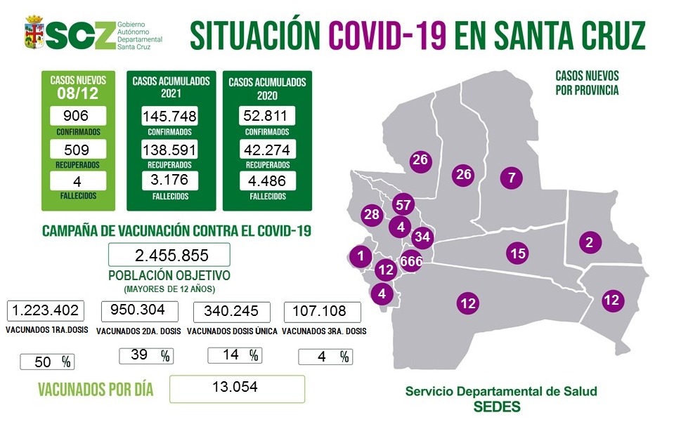 Santa Cruz, 08 de diciembre de 2021.- Los contagios de Covid-19 siguen en ascenso en el Departamento, está jornada de acuerdo al reporte emitido por el Servicio Departamental de Salud se registran 906 casos positivos de los cuales 634 pertenecen a la ciudad de Santa Cruz y los restantes se distribuyen en 41 municipios, informó Carlos Hurtado, gerente de Epidemiología del Sedes, al decir que esta cifra no se registraba desde el pasado 11 de junio del presente año y es el tercer día consecutivo que se supera en 21% de positividad.