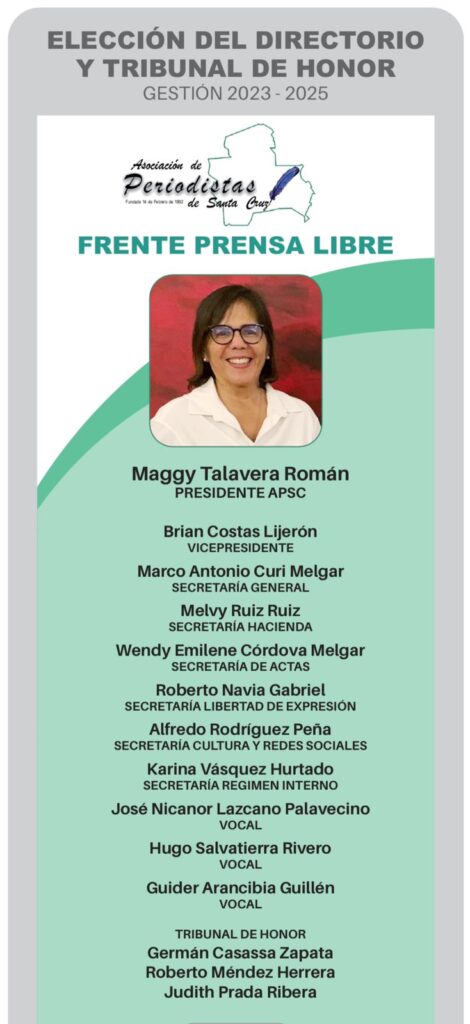 El único frente que se postuló fue el de Prensa Libre liderado por Maggy Talavera Román. Tras el conteo de votos, Panique declaró ganadora a la prestigiosa periodista cruceña y su plancha.