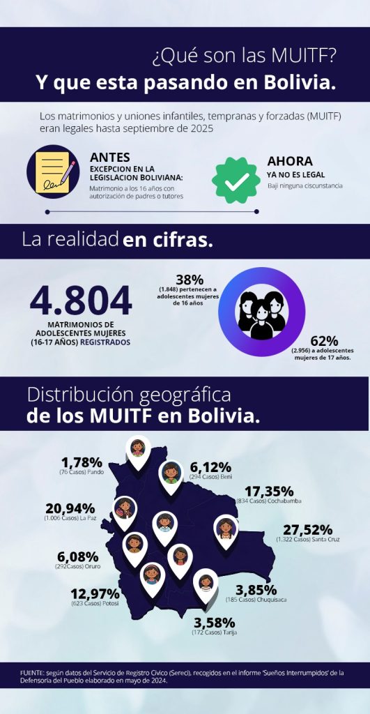 La eliminación de los Matrimonios y Uniones Infantiles, Tempranas y Forzadas (MUITF) fue un gran logro del Estado boliviano en 2025, con la promulgación de la ley 1639, pero resta su socialización para prevenir nuevos casos.