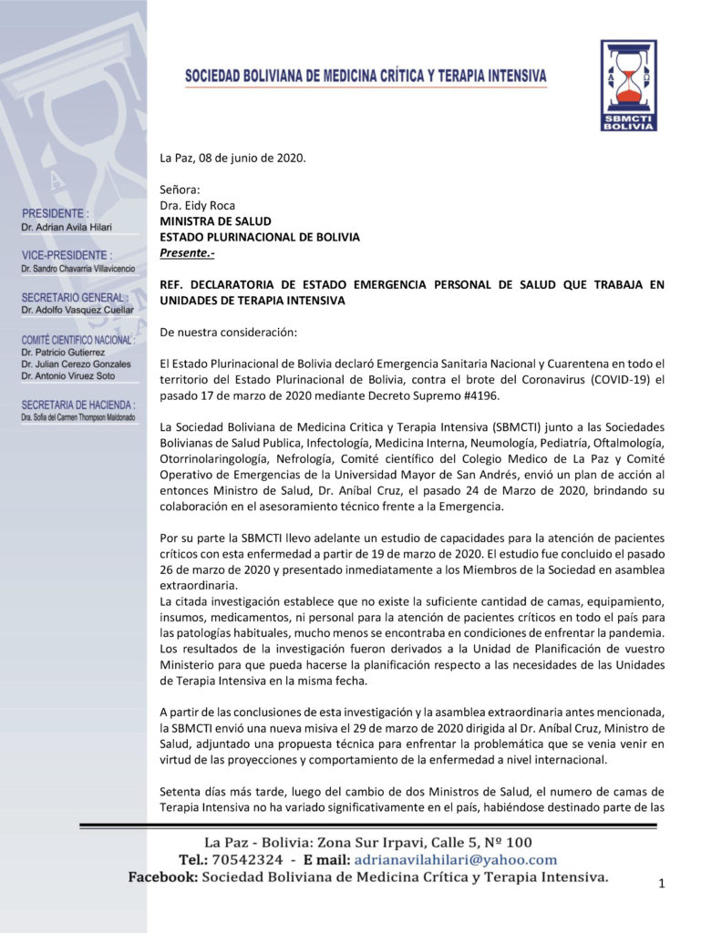 No hay suficientes camas, equipamientos, insumos, medicamentos, ni personal necesario para la atención de pacientes críticos por COVID-19. Ya no eran suficientes antes de que la pandemia llegara a Bolivia, como se encargaron de darle a conocer al ministro Cruz, el 24 de marzo pasado, las Sociedades Bolivianas de Medicina Crítica y Terapia Intensiva, Salud Pública, Infectología, Medicina Interna, Neumología, Pediatría, Oftalmología, Otorrinolaringología y de Nefrología, el Comité Científico del Colegio Médico de La Paz y el Comité Operativo de Emergencias de la Universidad Mayor de San Andrés.
