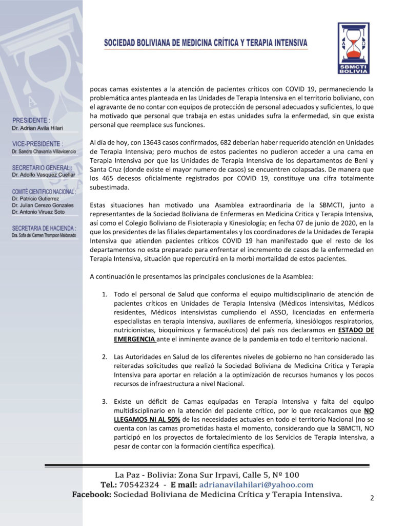 “Considerando que a la fecha los casos positivos confirmados fueron 13.643, al menos 682 de estos deberían haber requerido de atención en las UTI. Muchos no lo hicieron, simplemente porque no pudieron acceder a una cama en Terapia Intensiva, porque las unidades están colapsadas, sobre todo en los departamentos de Santa Cruz y Beni”, detalla el pronunciamiento.