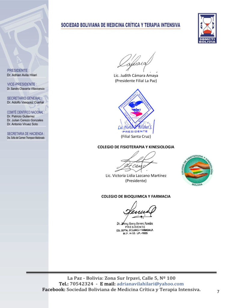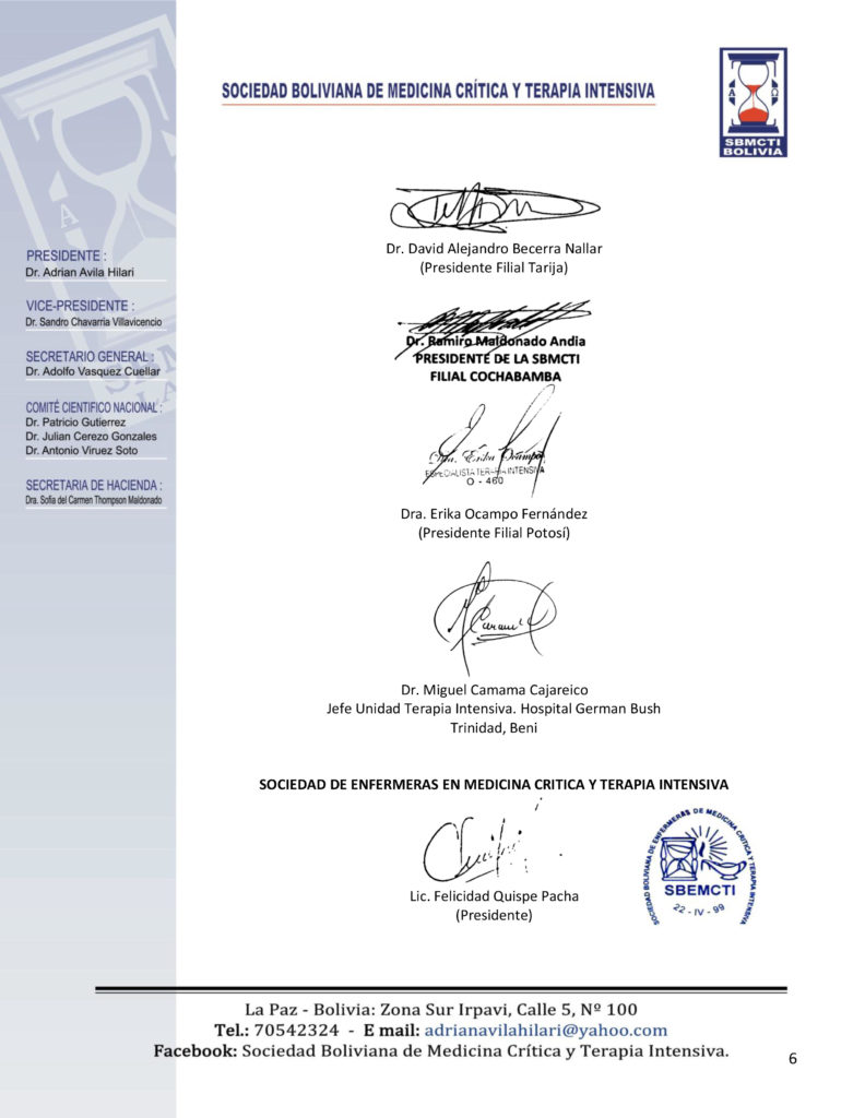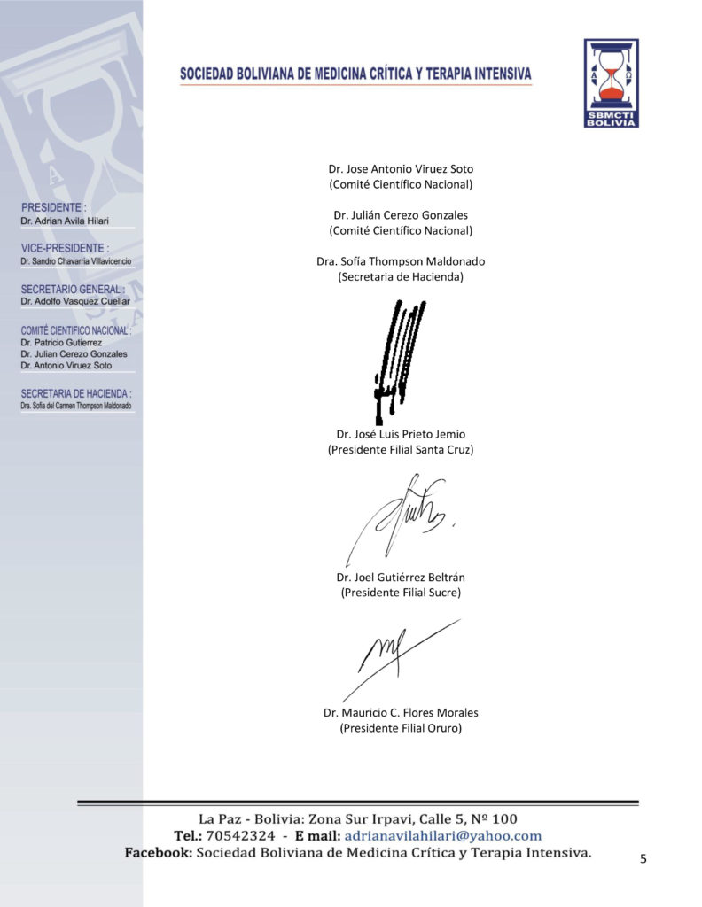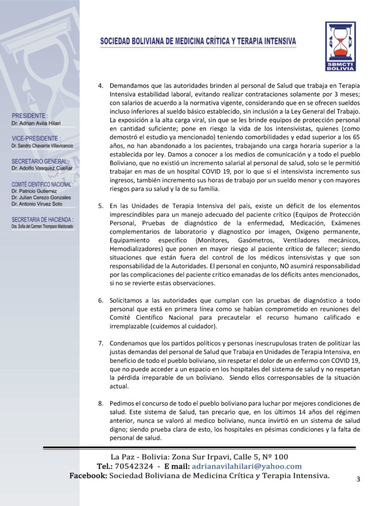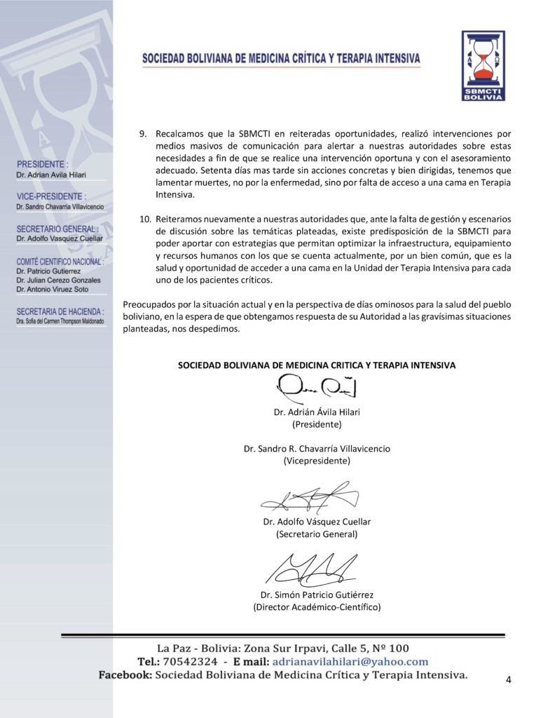 Las Sociedades Bolivianas de Medicina Crítica y Terapia Intensiva, y de Enfermeras en Medicina Crítica y Terapia Intensiva, así como el Colegio Boliviano de Fisioterapia y Kinesiología, sintetizan en diez puntos sus demandas.