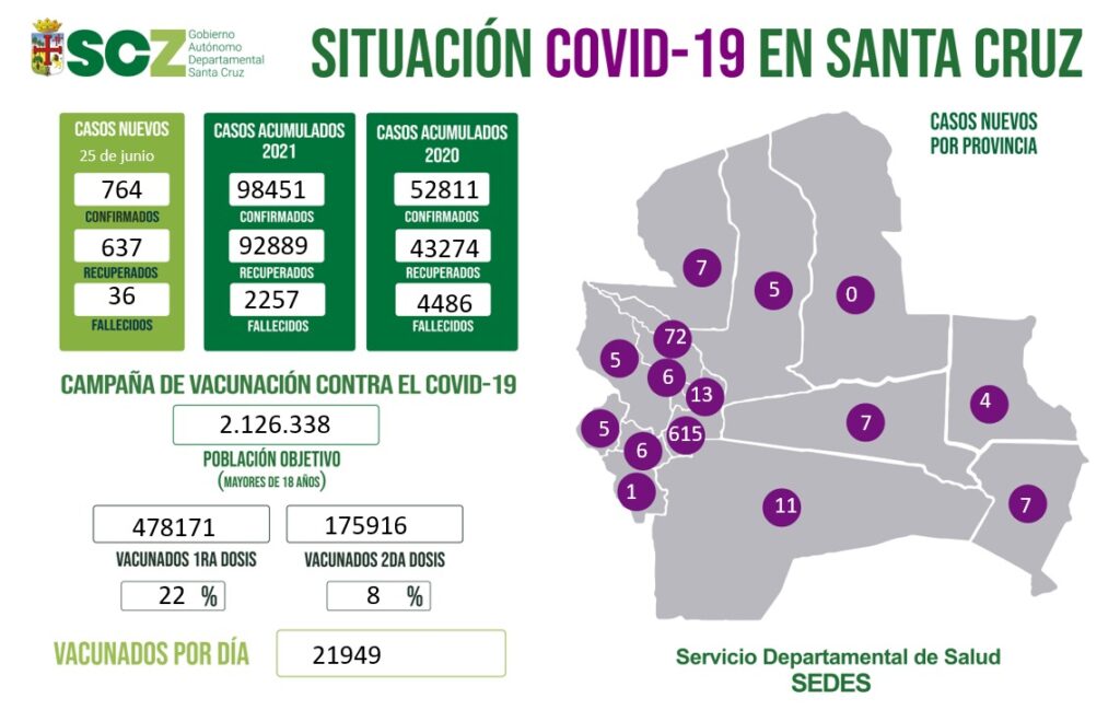 Con 21.949 personas vacunadas en la jornada de este viernes, Santa Cruz registra récord en el proceso de inmunización en el país, así lo hizo conocer el Gerente de Epidemiología del Sedes, Carlos Hurtado, al momento de dar a conocer la situación epidemiologíica en el departamento.