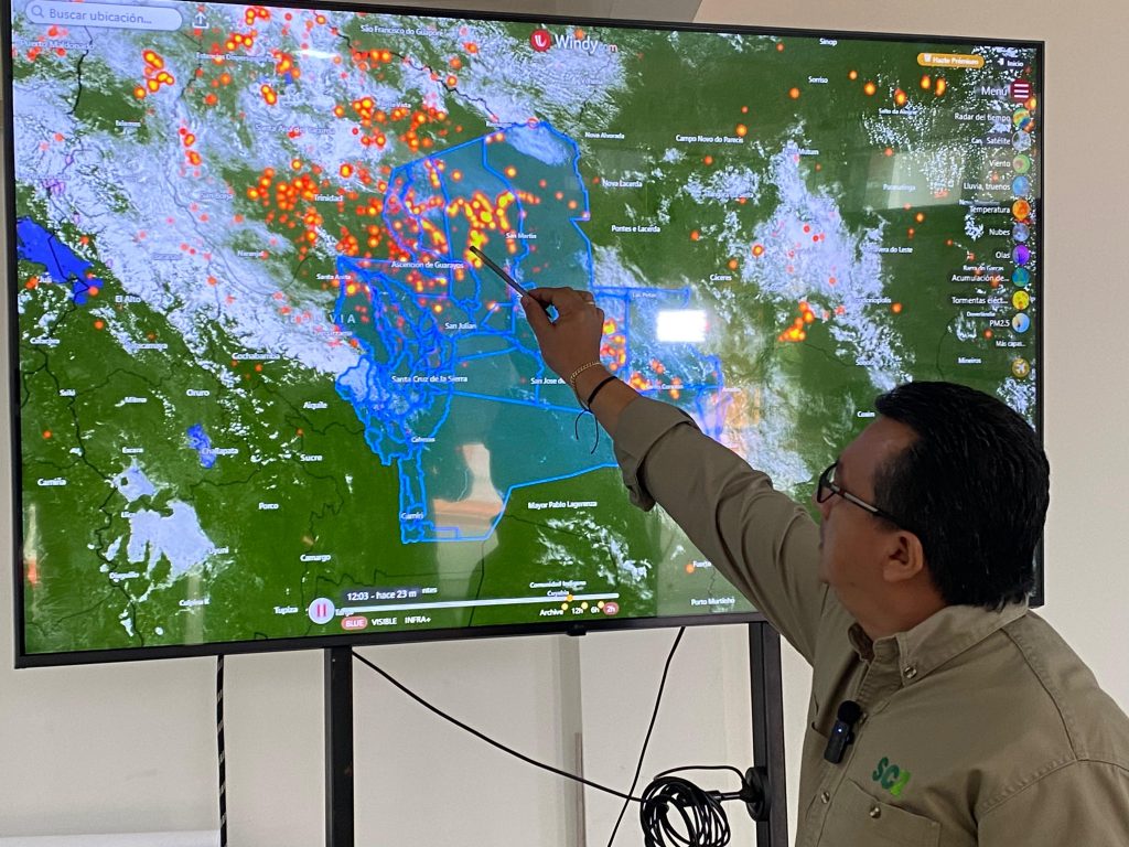 Jhonny Rojas, coordinador del COED, afirmó que continúan los 11 complejos de incendios y se registran 26 comunidades afectadas. Recalcó que la Gobernación tiene más de 1.000 personas desplazadas y equipos, como 9 camionetas forestales con ataque rápido, 18 de apoyo, motoniveladoras, orugas, cisternas, minibuses, volquetas, micros, tractores con cisterna, pala cargadora, skidders, cuadratracks, lowboy, drones, motobombas y chatas cisternas.