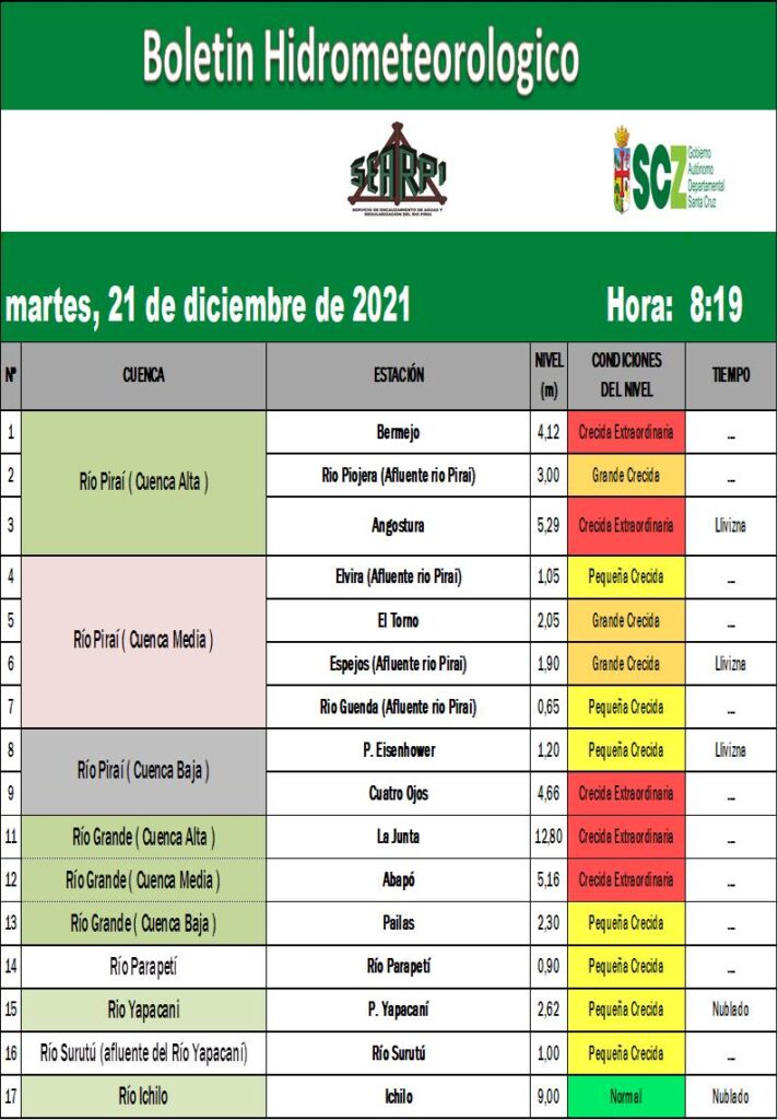 Santa Cruz 21 diciembre 2021.- La lluvia caída en diferentes zonas del departamento durante la madrugada del martes, han provocado una crecida extraordinaria en los ríos de Santa Cruz, provocando así una alerta roja en toda la región.