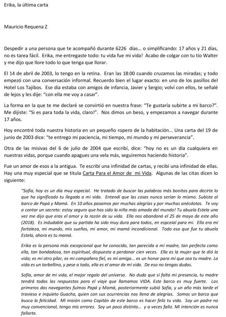 Mauricio Requena perdió hace nueve días al amor de su vida, Ericka Salvatierra Castedo, su compañera, madre de sus dos niños. No fue fácil asimilar esa pérdida, por lo absurdo de las circunstancias que la arrancaron de sus seres amados en menos de una semana.