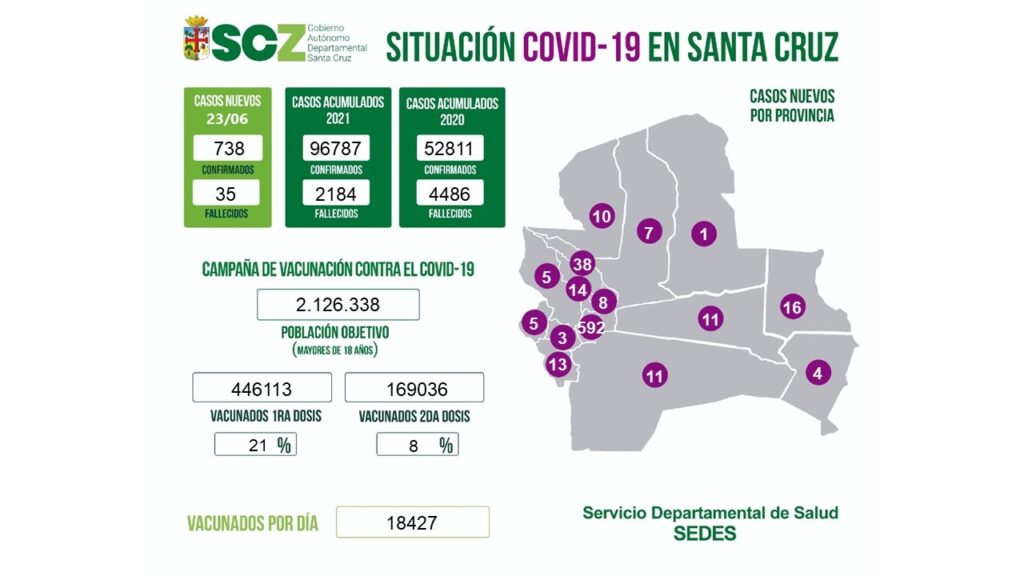 En lo que corresponde a la situación epidemiológica, Santa Cruz se encuentra en una desaceleración de la curva de contagios y esto se debe a los avances en la vacunación y a las medidas de contención y dispersión social que se dictaron desde el COED para interrumpir la cadena de transmisión, subrayó Hurtado, al decir que hoy se registraron 738 nuevos contagios los cuales se distribuyen en 38 municipios.