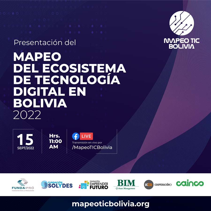 Si está pensando crear una startup o desea saber cómo se manejan estas en Bolivia, debe estar atento al lanzamiento del Mapeo del Ecosistema de Tecnología Digital del país. Se trata de un trabajo realizado por FUNDA-PRÓ, Fundación Solydes, Fundación Emprender Futuro, BIM Asset Management, ICCO Cooperación y Santa Cruz Innova – Cainco, que será presentado en un evento virtual el jueves 15 de septiembre, a las 11:00 de la mañana.