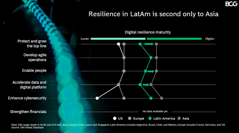 Debido a que la región siempre ha experimentado niveles más altos de volatilidad, las empresas latinoamericanas son más resilientes. Tal como lo demuestra la encuesta de BCG, el 85 % de los ejecutivos latinoamericanos planean invertir más en su transformación digital a consecuencia del Covid-19, lo que supone un compromiso mucho más firme respecto al 65 % de sus pares globales. De acuerdo con el estudio de BCG, lo más probable es que esto genere buenos resultados: cuando se realizan correctamente, estas inversiones mejoran la resiliencia, ya que aumentan la agilidad, la estabilidad y la productividad de la fuerza laboral, y optimizan el desempeño financiero, pues generalmente incrementan en más del doble el valor empresarial.