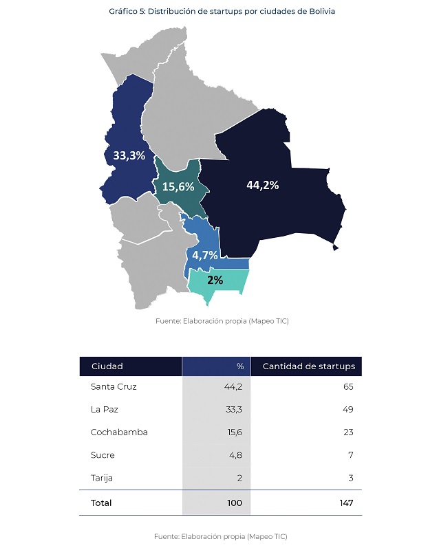 De acuerdo con los datos del “Mapeo del ecosistema de tecnología digital en Bolivia 2023” se identificó 147 “startups” o empresas digitales; 93% de éstas tienen sus bases de operaciones en Santa Cruz, La Paz y Cochabamba. Se destaca que el 30% de estos emprendimientos atienden la demanda de negocios virtuales en el rubro financiero.